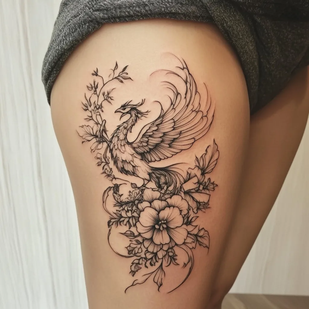 Thigh or Hip: These areas are ideal for a phoenix with dramatic tail feathers or intricate detailing. It’s a bold yet intimate placement, often chosen for its blend of beauty and personal significance.
