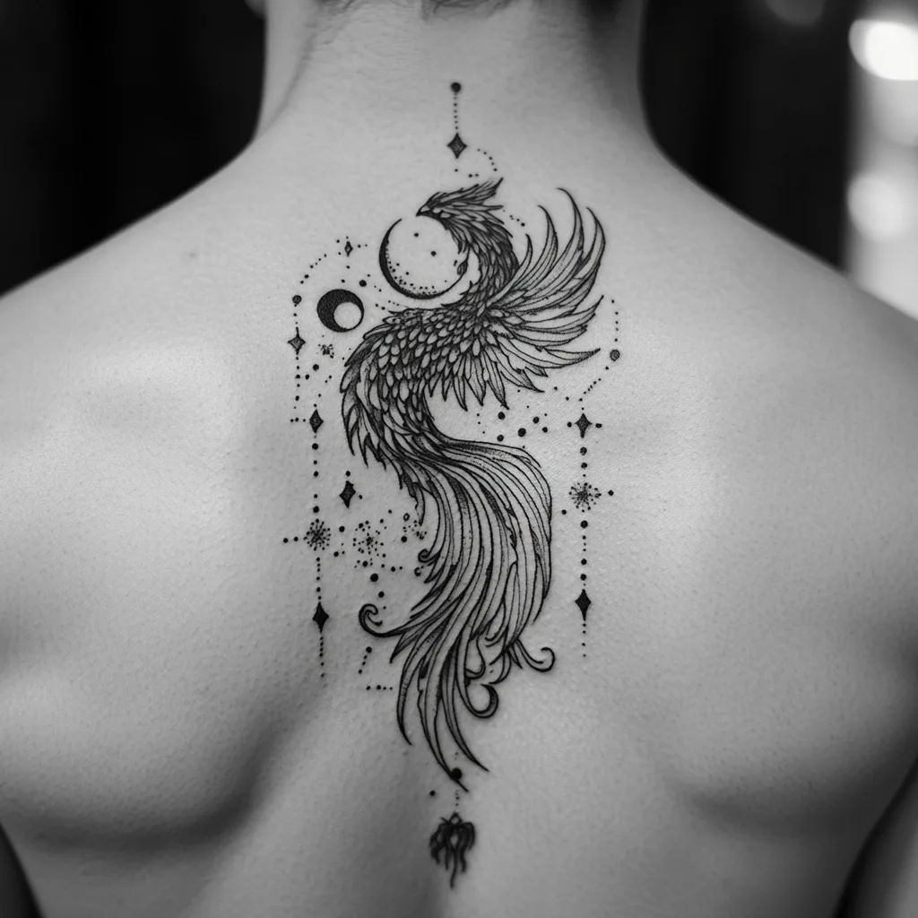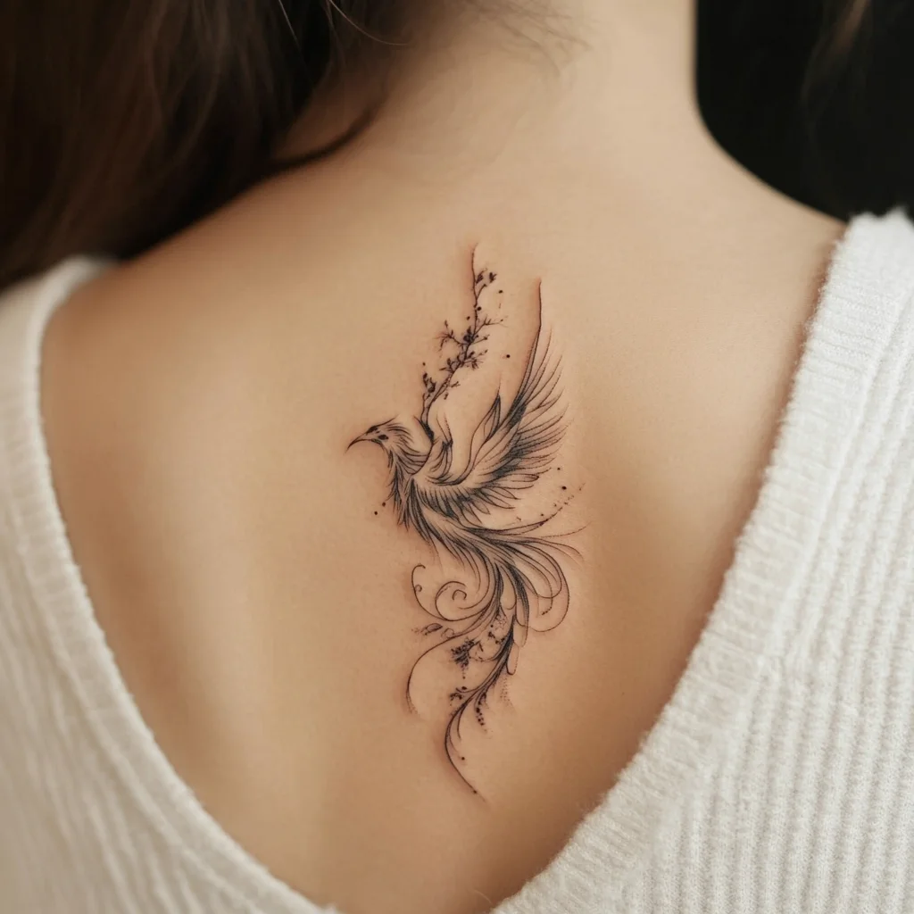 Back: The back offers the perfect space for a full phoenix in flight. Wings can stretch across the shoulder blades or sweep up toward the neck, while the tail feathers can trail down the spine. This placement is dramatic and empowering, especially for women who want to showcase the full rebirth imagery.