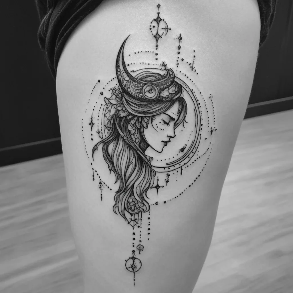 A cosmic goddess tattoo with zodiac features celebrates feminine energy, intuition, and celestial wisdom. This design often includes a celestial woman with zodiac symbols, planetary elements, and stars surrounding her. It represents empowerment and connection to the universe. Placed on the upper arm, thigh, or ribcage, this tattoo is an artistic and mystical representation of astrological influence.