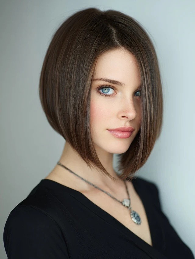 - Sleek straight hair emphasizes the clean angle.