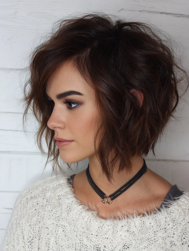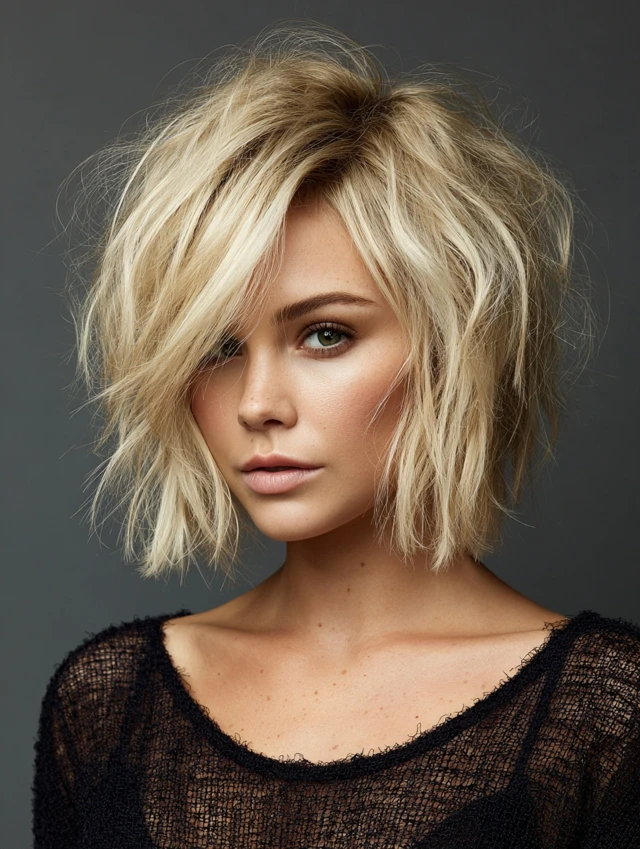 Tousled, messy texture creates a relaxed, effortless vibe while maintaining the bob’s edgy shape.