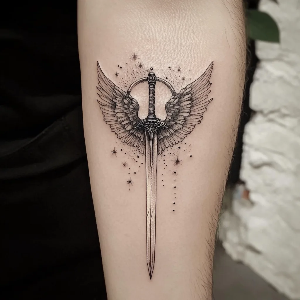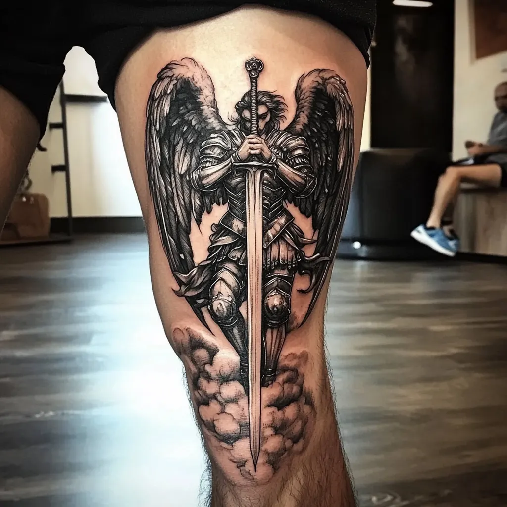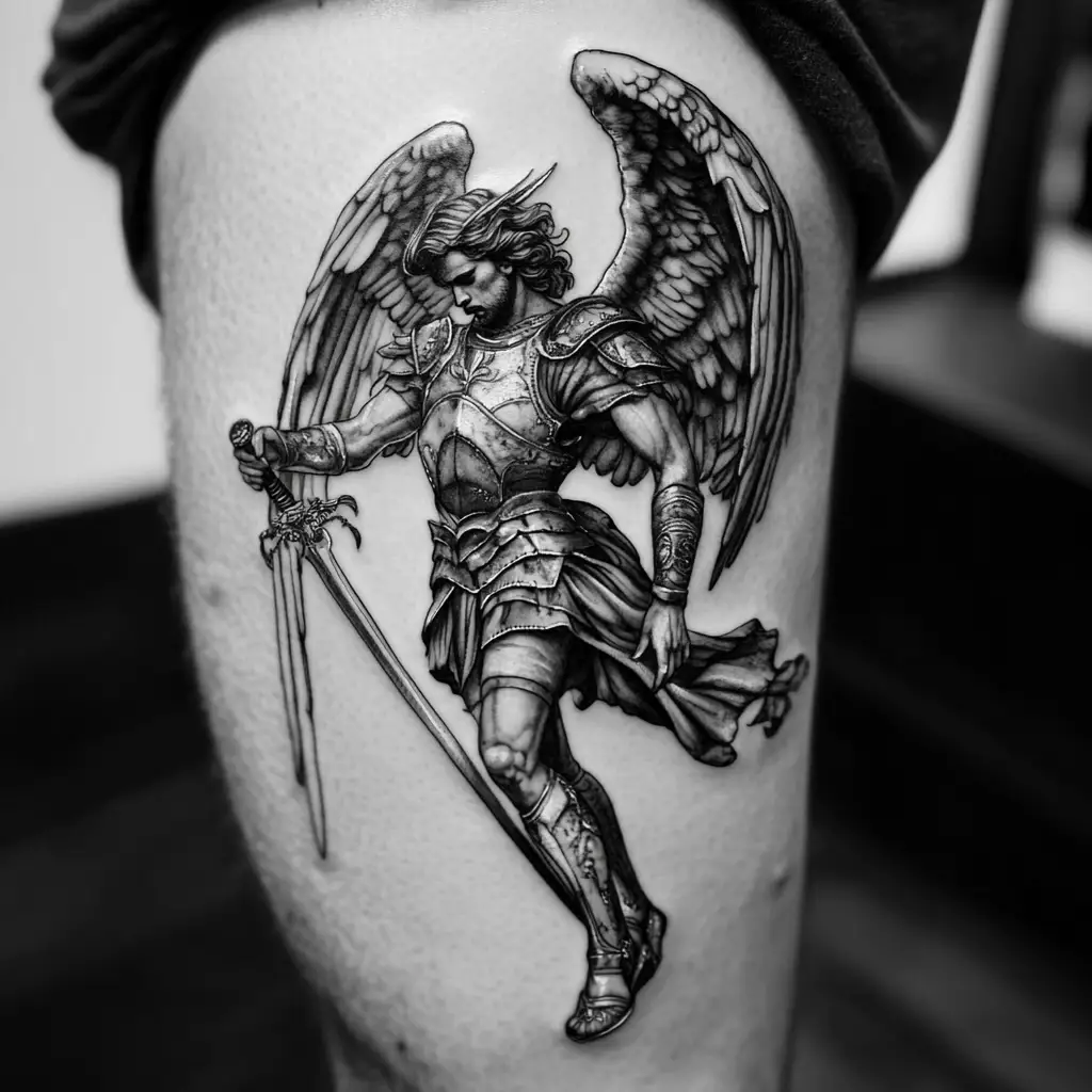 For those seeking a more discreet but deeply personal placement, the ribcage, sternum, or thigh work well. These areas offer space for vertical compositions and add an intimate layer to the artwork. A subtle Archangel silhouette or sword with wings can blend divine strength with feminine grace.