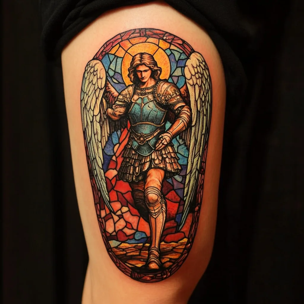Inspired by the beauty of cathedral stained-glass art, this tattoo features Archangel Michael in colorful, detailed designs reminiscent of church windows. This style is unique and artistic, offering a different take on traditional religious tattoos. The blend of colors and patterns makes it visually striking. This tattoo is best suited for the forearm, upper arm, or back, where the details can shine.