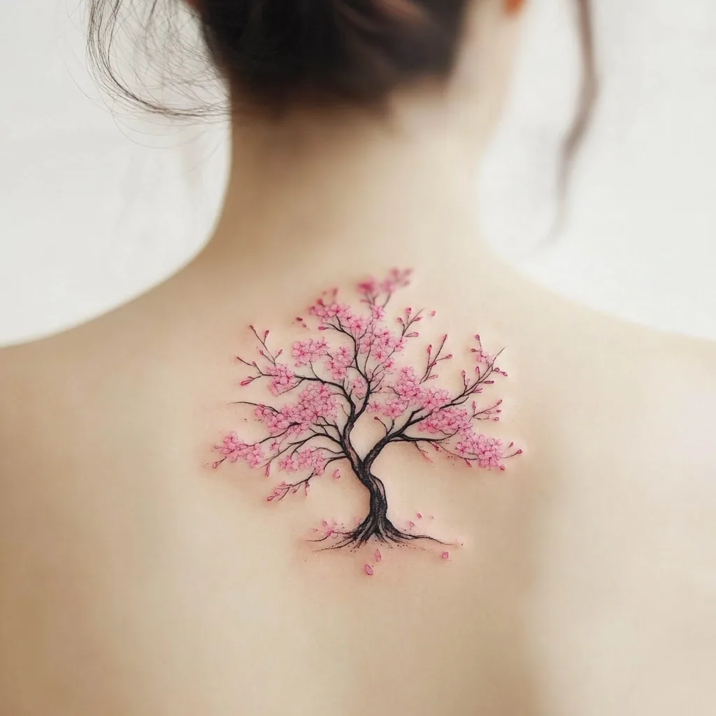 A cherry blossom tree tattoo on the back captures the fleeting beauty of life with its soft pink and white flowers. This design spreads across the back like a blooming tree, symbolizing renewal and the transient nature of existence. The tattoo’s intricate details, like the twisting branches and delicate petals, add a touch of elegance and grace. This tattoo not only celebrates nature’s beauty but also serves as a reminder to appreciate every moment. Ideal for those who connect with nature, it offers a gentle yet powerful statement of resilience and beauty.