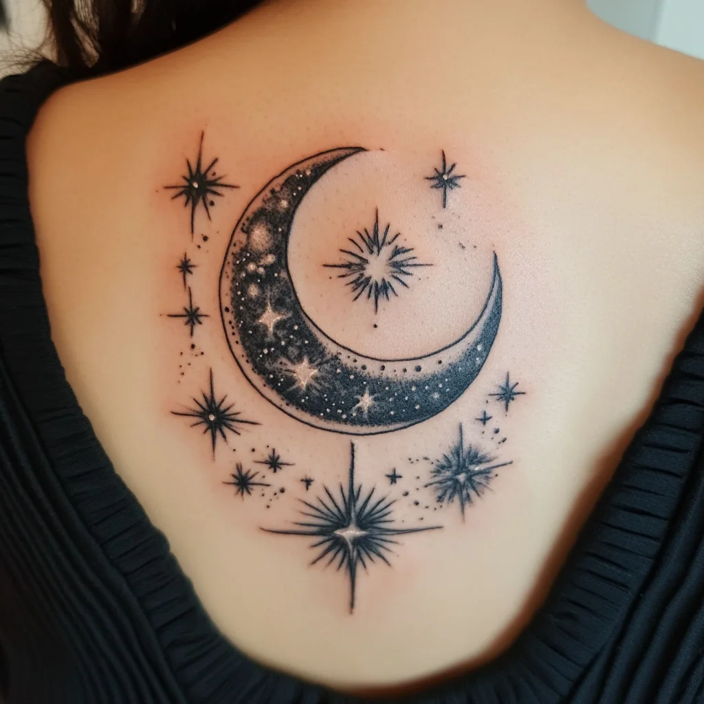 A moon and stars tattoo is an enchanting design that represents mystery, femininity, and guidance. Placed across the upper back, the crescent moon can be adorned with intricate star patterns to create a dreamy, celestial scene. This tattoo is ideal for those who feel connected to the night sky or wish to embody a sense of calm and introspection. It also serves as a symbol of illumination and hope, reflecting the idea that even in darkness, there is always light. With delicate linework, this tattoo can be a subtle, yet captivating, expression of individuality.