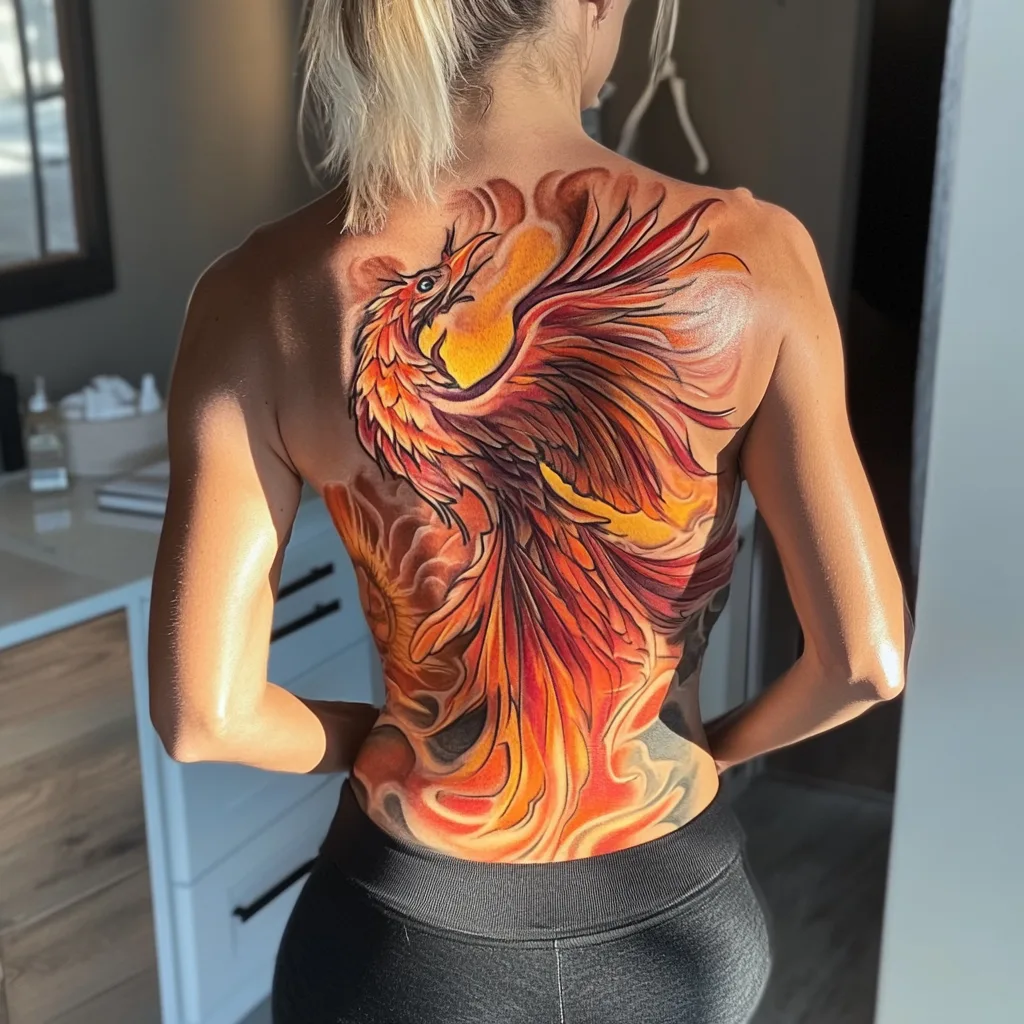 The phoenix, a mythical bird known for rising from its ashes, symbolizes rebirth and transformation. A phoenix rising across the back conveys strength, personal growth, and overcoming adversity. The design features vibrant colors that represent fiery passion and energy, with wings that stretch across the shoulder blades. The flowing design adds movement, symbolizing freedom and resilience. This tattoo is perfect for someone who has undergone significant life changes or is seeking to represent their personal journey of empowerment.