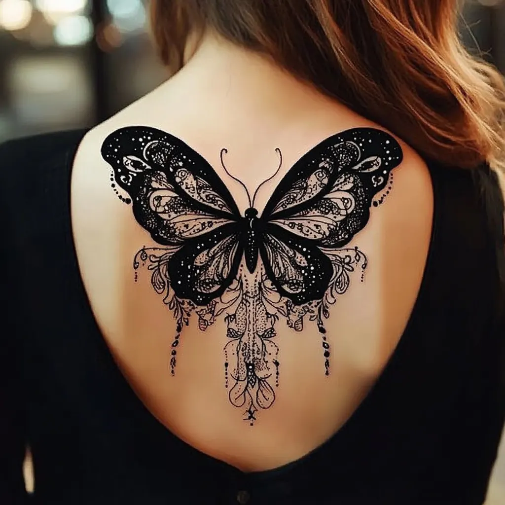 A butterfly tattoo represents transformation, beauty, and freedom. A butterfly tattoo on the back can be placed near the shoulders, with the wings extending across the upper back. The delicate lines and intricate wing patterns create a sense of elegance and movement. This tattoo is symbolic of change and growth, making it a meaningful design for those who have experienced personal transformation or who appreciate the metaphor of starting fresh. The butterfly’s graceful form also adds a feminine touch to the back, making it a popular choice for women.
