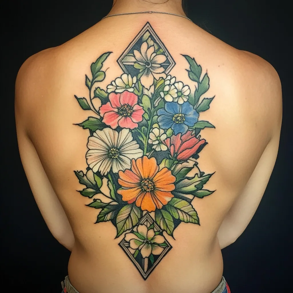 Combining floral elements with geometric shapes, this tattoo design creates a modern, balanced aesthetic. The symmetry of geometric shapes contrasts beautifully with the organic flow of floral patterns. The design can span across the upper back or even cover the entire back, creating a stunning visual impact. This tattoo can symbolize harmony, unity, and the connection between nature and structure. It’s perfect for someone who enjoys both natural beauty and the clean lines of geometric design, offering a sophisticated and eye-catching tattoo option.