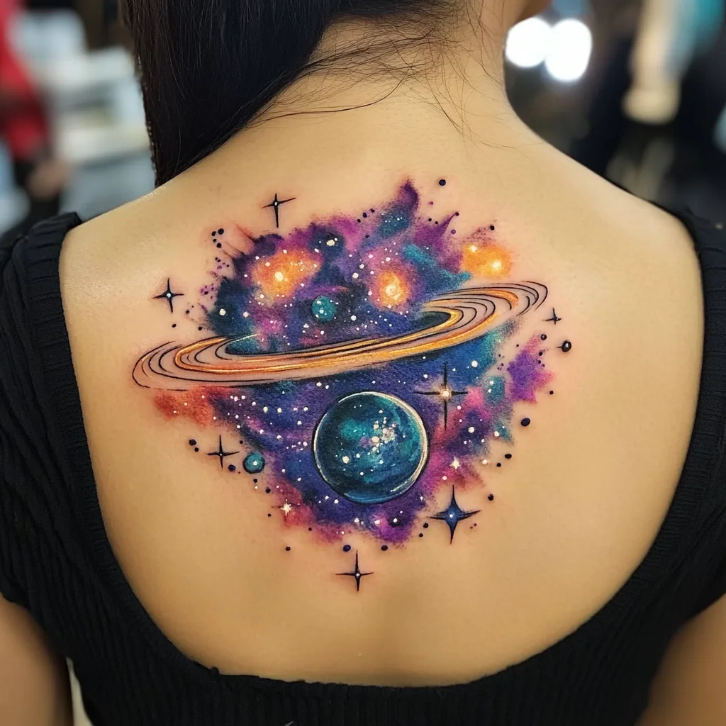 A watercolor galaxy tattoo on the back features a blend of vibrant colors, creating a dreamy, cosmic scene. The abstract, flowing colors resemble the stars, planets, and galaxies, evoking a sense of wonder and possibility. This tattoo symbolizes the vastness of the universe and the endless potential within oneself. The soft, flowing nature of watercolor tattoos allows for a dynamic, ever-changing design, making it an ideal choice for someone who embraces creativity, exploration, and the beauty of the unknown.