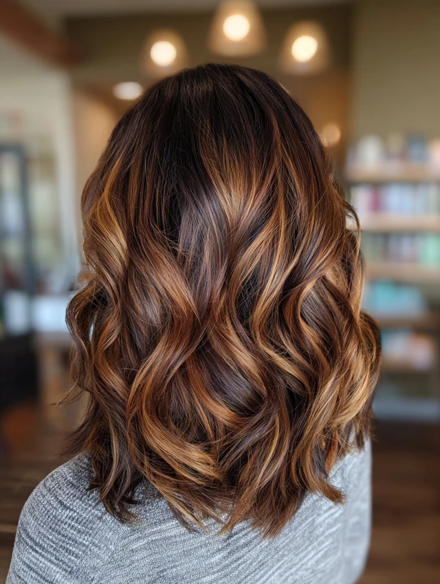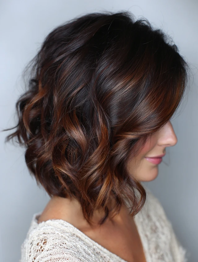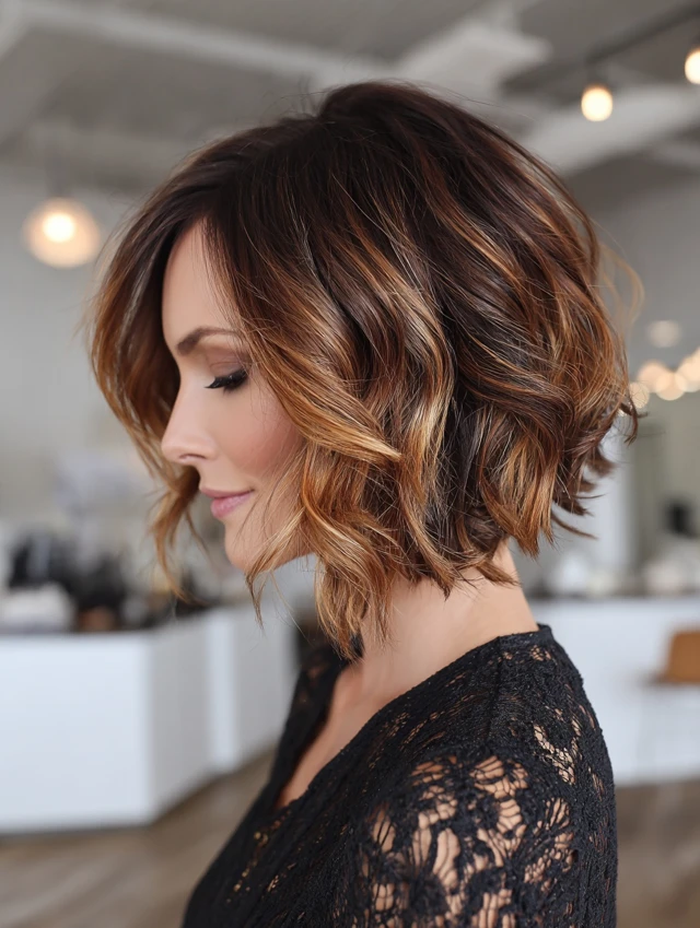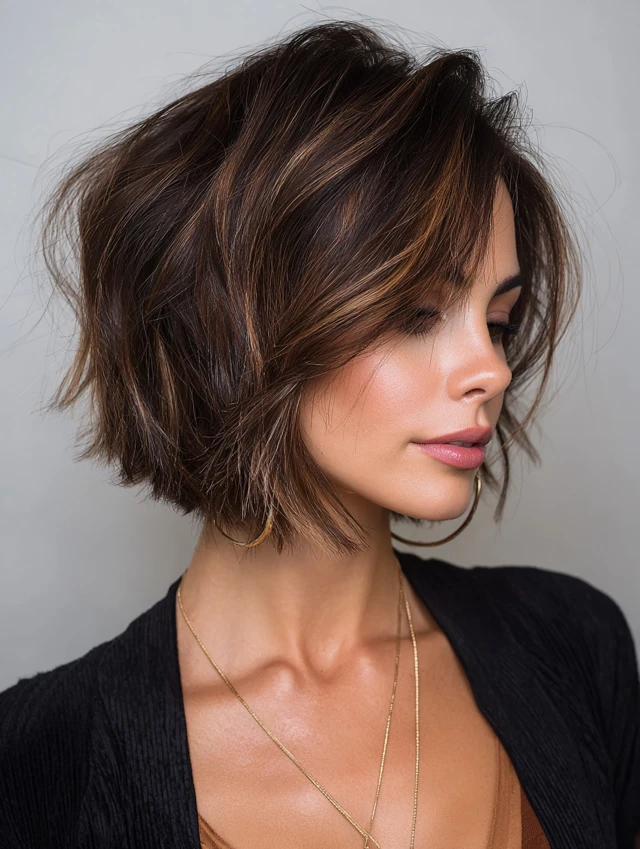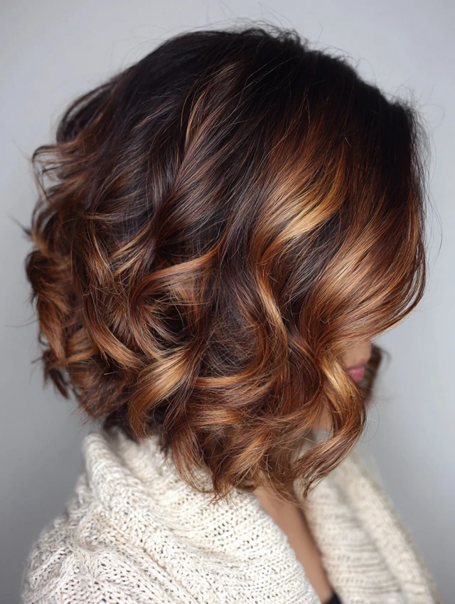 Warm caramel highlights brighten dark hair beautifully and make short cuts look soft and dimensional.