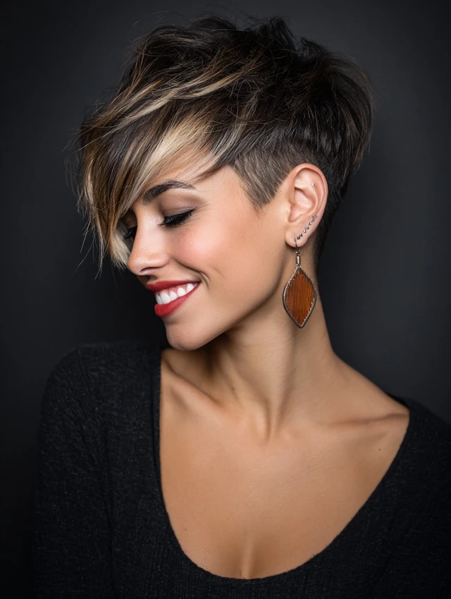 A pixie with balayage highlights creates depth at the crown and adds dimension to the longer top layers.