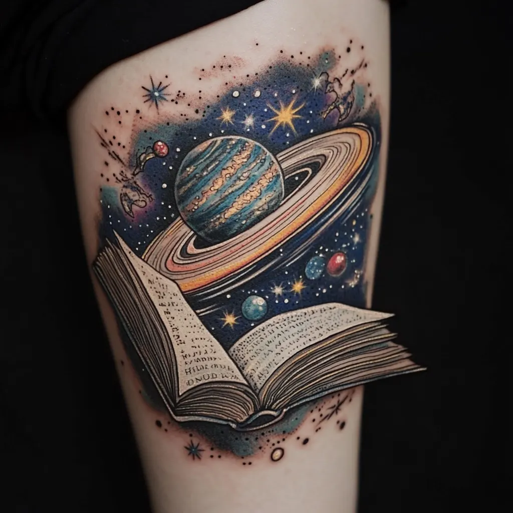 A book opening up to reveal a vast universe of stars, planets, and galaxies signifies the infinite possibilities within stories. This tattoo represents how books transport readers beyond reality into extraordinary worlds. The design can be detailed with intricate constellations or kept simple with a cosmic glow. Ideal placements include the arm, back, or thigh, where its beauty can be fully appreciated. This tattoo is perfect for dreamers, fantasy lovers, and those who see books as portals to endless adventures and knowledge. It’s a stunning tribute to the power of literature in expanding one’s imagination.