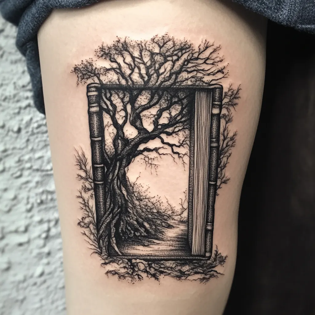 A book transforming into a doorway represents the idea that reading is an entrance into new worlds of knowledge and adventure. The design can feature an old wooden door, a glowing light emerging from within, or mystical vines creeping around the edges. Best placed on the forearm, ribs, or thigh, this tattoo serves as a reminder that every book holds the key to unexplored realms. This tattoo is ideal for those who see reading as an endless journey into the unknown, making it a beautiful and meaningful piece for any literature enthusiast.