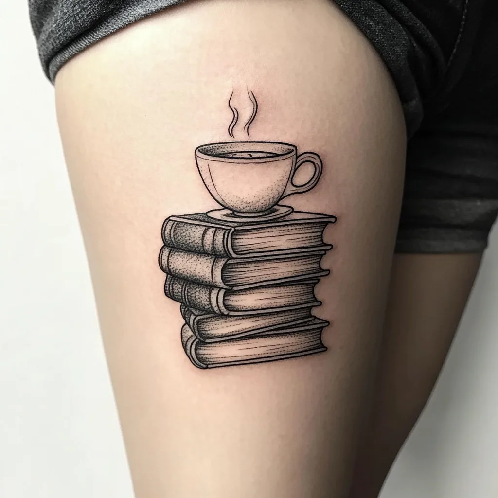 A book with a steaming cup of coffee or tea embodies the comfort and joy of reading. This tattoo symbolizes relaxation, knowledge, and self-care. It can be enhanced with elements like swirling steam forming words or delicate floral details. Common placements include the wrist, ankle, or shoulder blade, making it a subtle yet meaningful choice. This design is perfect for those who cherish quiet moments curled up with a book and a warm drink. It represents the soothing effect that reading has on the soul and serves as a reminder to always make time for literature.