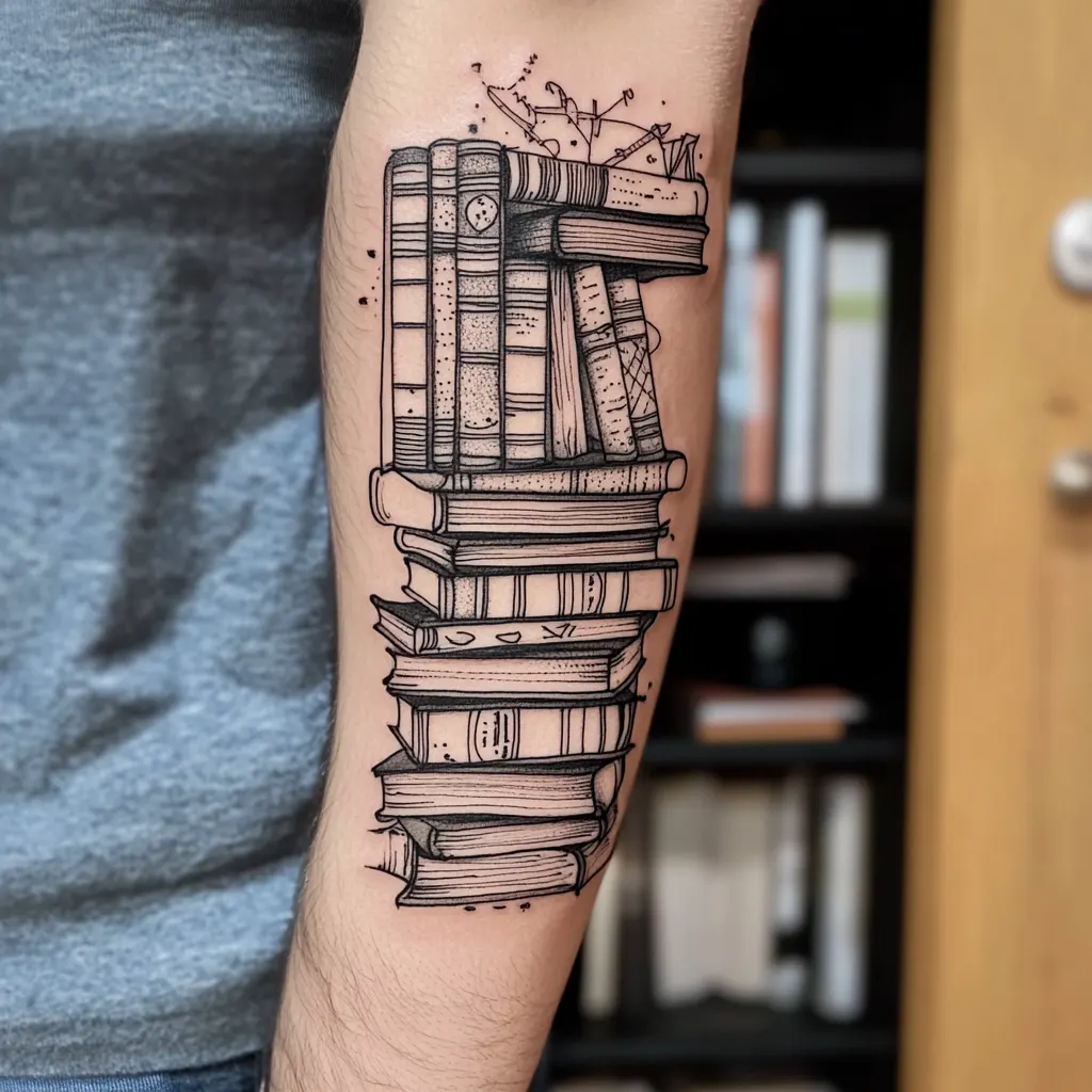 A neat stack of books represents a lifelong love of reading and collecting knowledge. This tattoo can be personalized with book titles that hold special meaning or left blank for a minimalist touch. Adding elements like a cup of tea, reading glasses, or a candle enhances its aesthetic appeal. This design works well on the wrist, ankle, or upper arm. It serves as a beautiful representation of the stories that have shaped one’s journey and the continuous quest for learning. Whether simple or detailed, a stack of books tattoo is a timeless symbol of literary devotion.