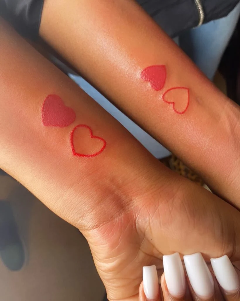 These red heart outline tattoos are a timeless expression of love and loyalty between best friends. One heart is filled, and the other outlined, creating a sense of balance and individuality while still being part of the same symbol.