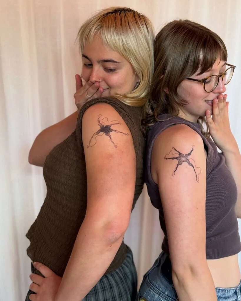 These delicate brittle star tattoos are a unique and meaningful choice for best friends who love ocean-inspired designs. Placed on the upper arms, the tattoos feature a starfish-like creature with long, flowing arms that appear both graceful and strong.