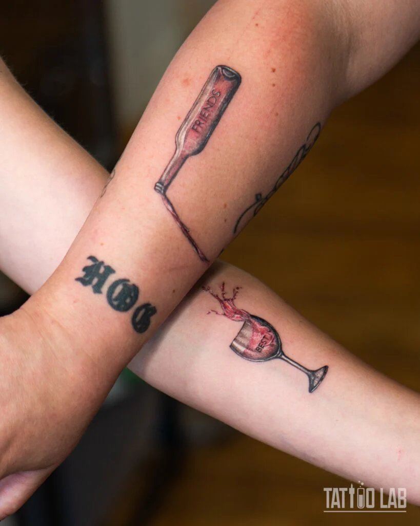 These creative tattoos show a wine bottle pouring into a glass, with “FRIENDS” written on the bottle and “EST” on the glass, completing the phrase “BEST FRIENDS.” It’s a playful and symbolic tattoo design for pairs who share laughs, late-night talks, and maybe a love of wine.
