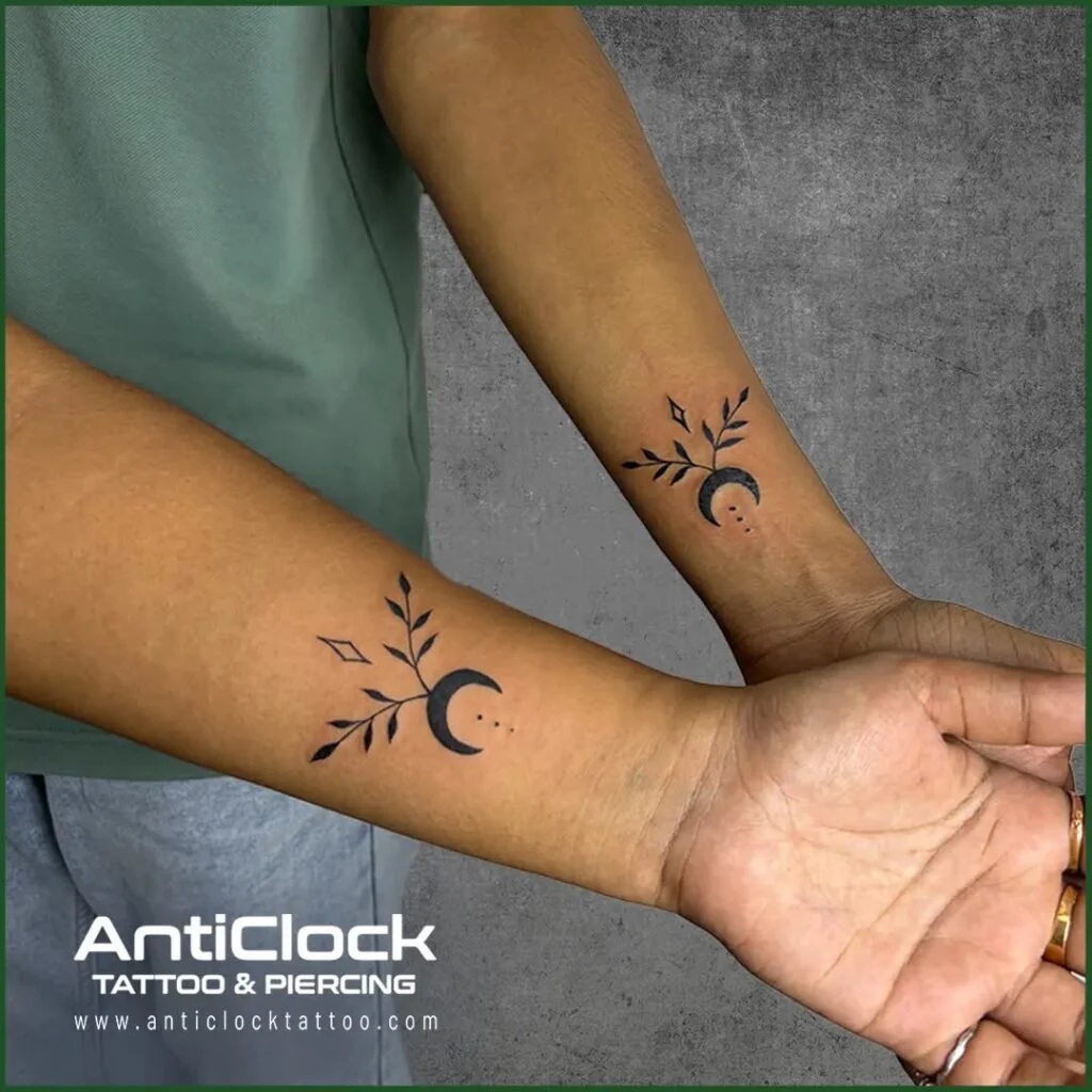 These matching tattoos combine a crescent moon with delicate branches, symbolizing growth, balance, and harmony in friendship. Placed on the inner forearms, the designs mirror each other, showing how two people can reflect strength and calmness while still standing unique.