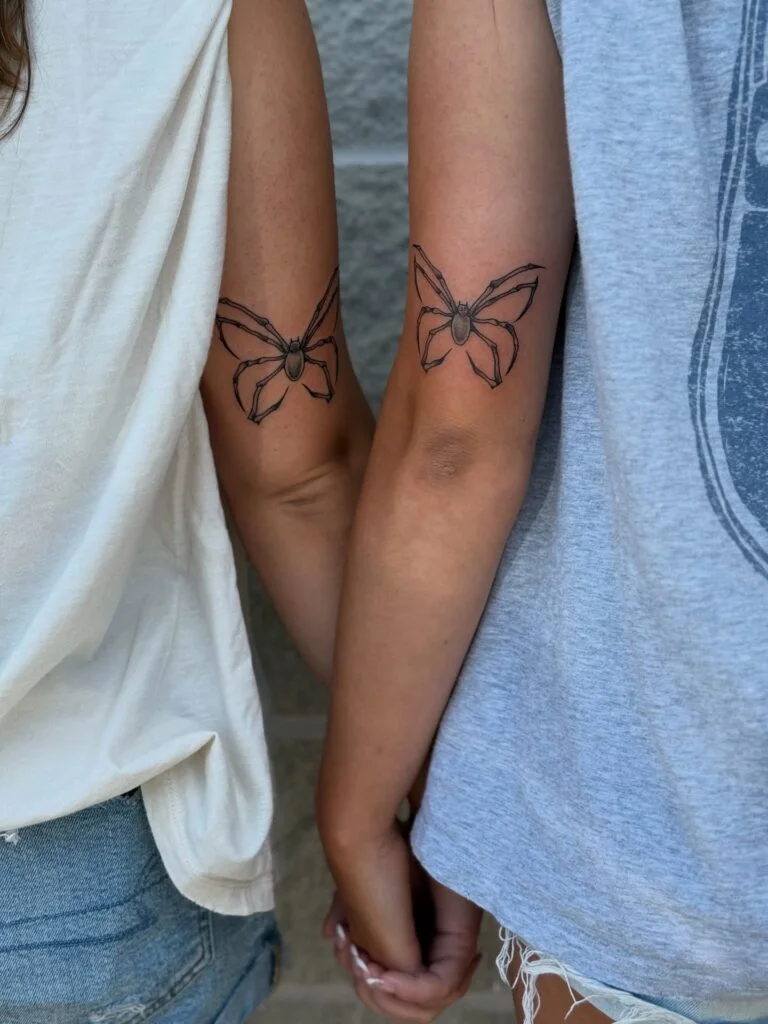 These bold spider tattoos symbolize resilience, creativity, and the unbreakable threads of friendship. Placed on the backs of the arms, the design features a realistic black spider with detailed legs stretching outward, creating a striking visual effect.