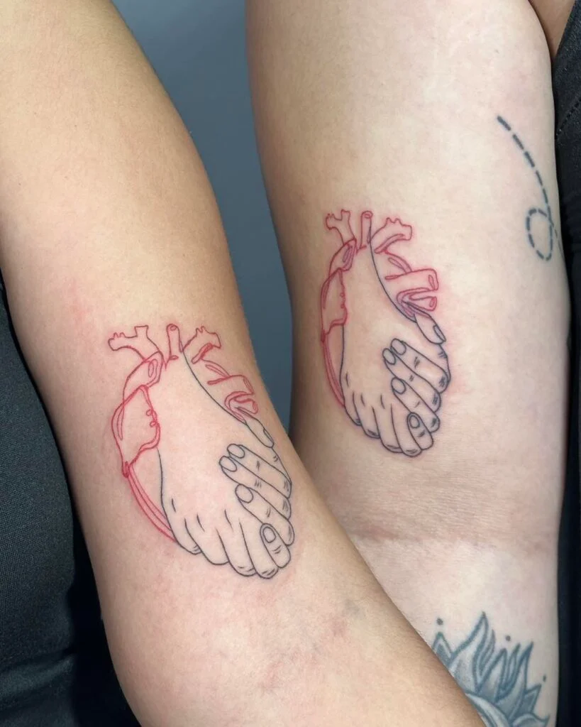 These tattoos combine the imagery of an anatomical heart with two hands clasped tightly together, symbolizing both emotion and support. Outlined in black and red ink, the design blends realism with artistry, representing how friendship comes from the heart while being grounded in connection.