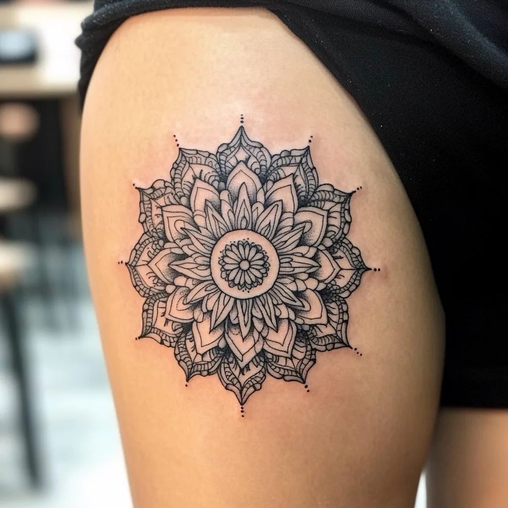 A mandala tattoo is an intricate and spiritually symbolic design that radiates from the center, often resembling a flower. Mandalas in black ink stand out beautifully, showcasing their fine details and symmetry. The design can cover the entire upper arm or be a smaller piece on the forearm or wrist. Mandalas are associated with balance, unity, and wholeness. For many women, this tattoo can represent inner peace and the interconnectedness of life. The circular patterns and sharp contrasts of the black ink give it a modern yet timeless look, perfect for those seeking a meaningful yet artistic tattoo.