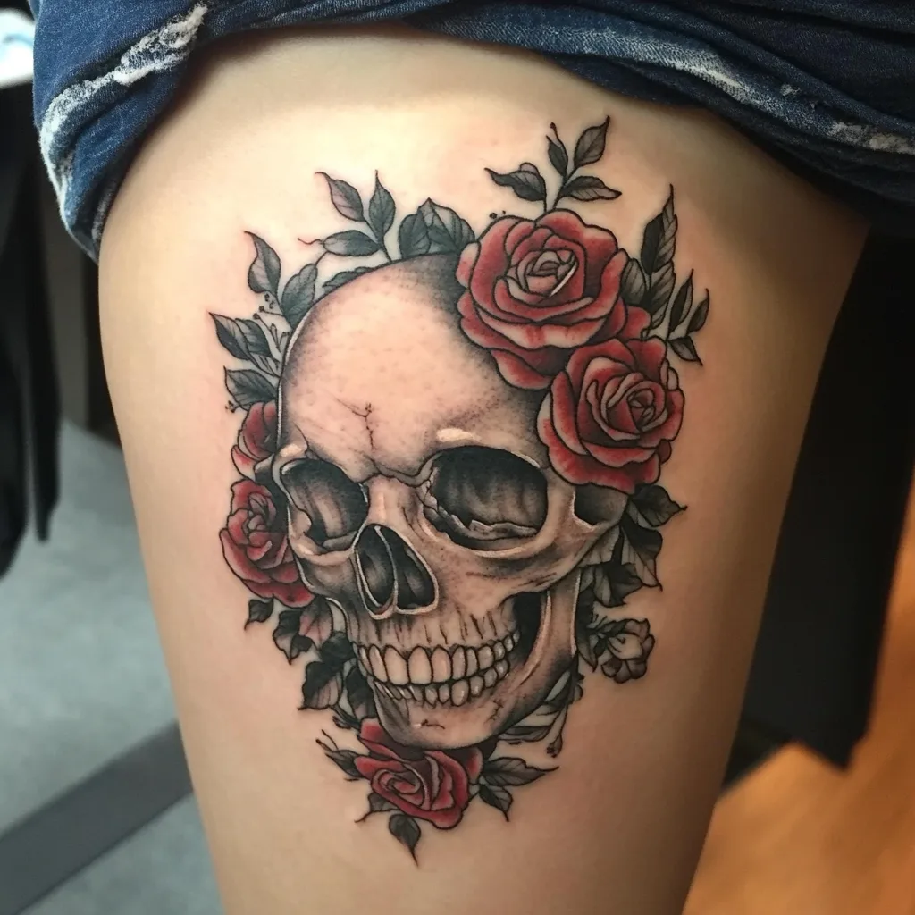 For a tattoo with a mix of edgy and feminine elements, a skull with roses is an excellent option. The black ink creates a stark contrast between the hardness of the skull and the softness of the roses. This design can be placed on the upper arm or across the forearm, allowing the roses to wrap around the skull or frame it beautifully. The skull can represent mortality, while the roses add a layer of beauty and love. This tattoo embodies the balance between life and death, strength and fragility, making it a powerful and deeply meaningful choice.