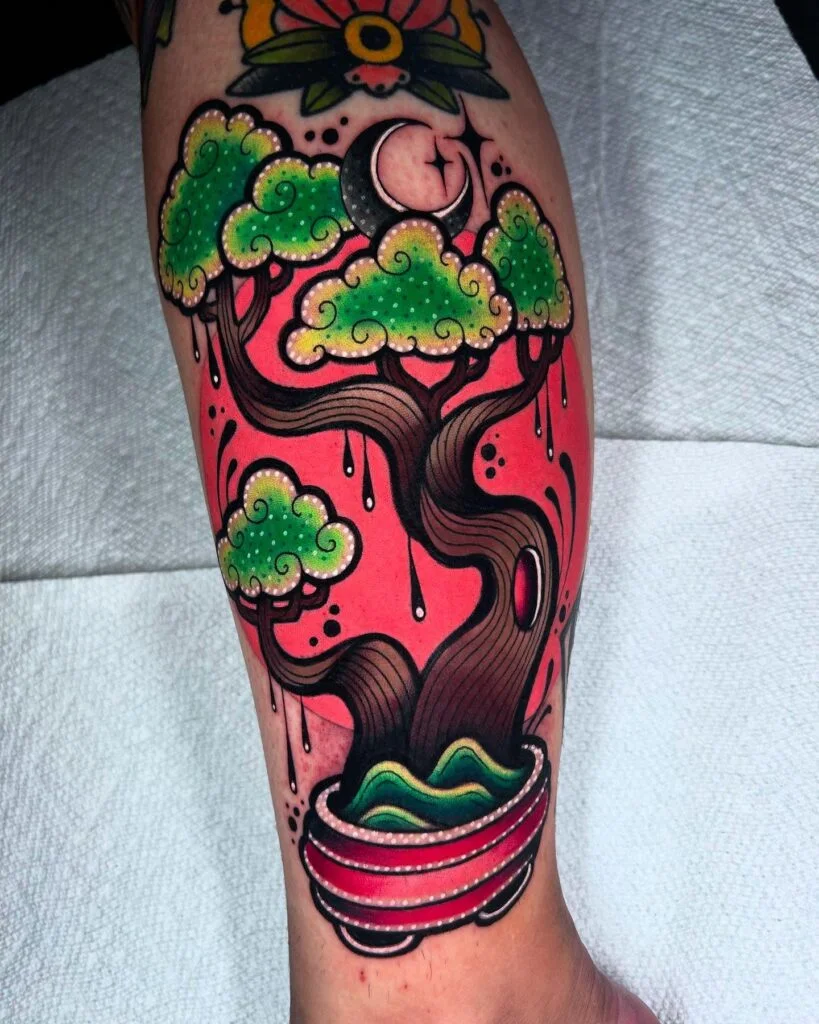 This bold tattoo depicts a flowing bonsai tree set against a vivid red backdrop, with a crescent moon nestled above its branches. The thick, twisting trunk conveys strength, while the cloud-like green foliage adds softness and grace. The round pot at the base completes the balance.