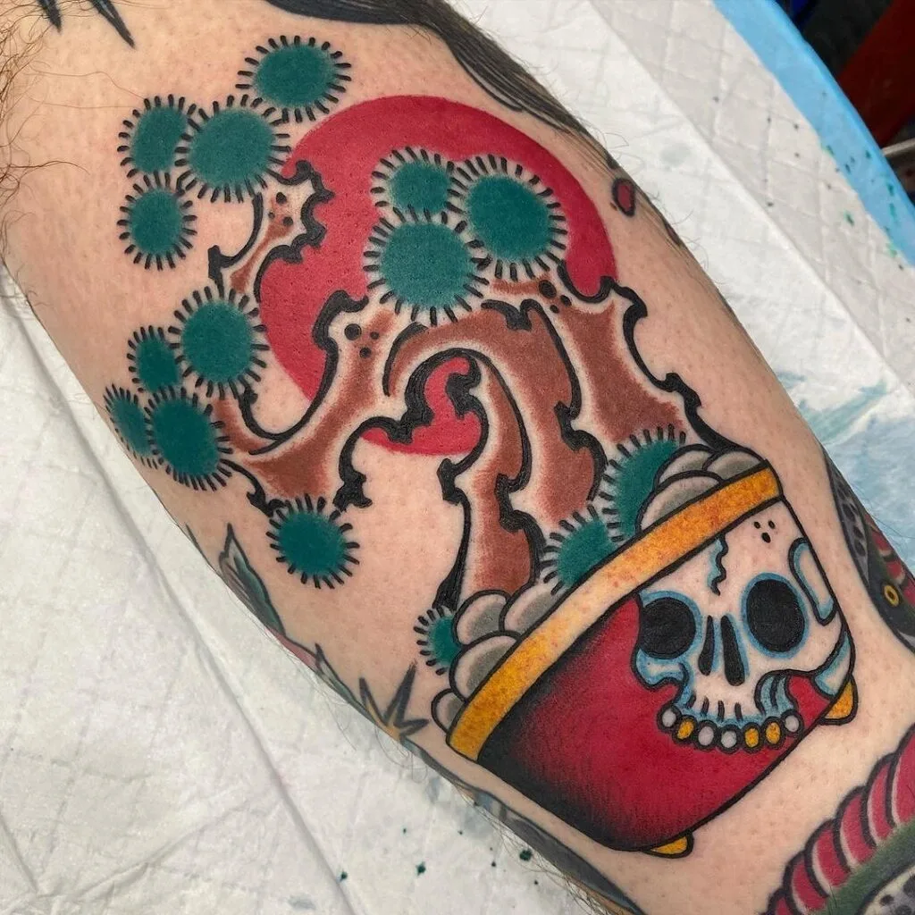 This tattoo presents a striking bonsai tree in a pot adorned with vivid skull motifs. The bright orange, teal, and earthy brown hues create a bold contrast, giving the design a mix of natural calmness and edgy symbolism. The twisted bonsai trunk represents resilience, while the skull details introduce themes of mortality and strength.