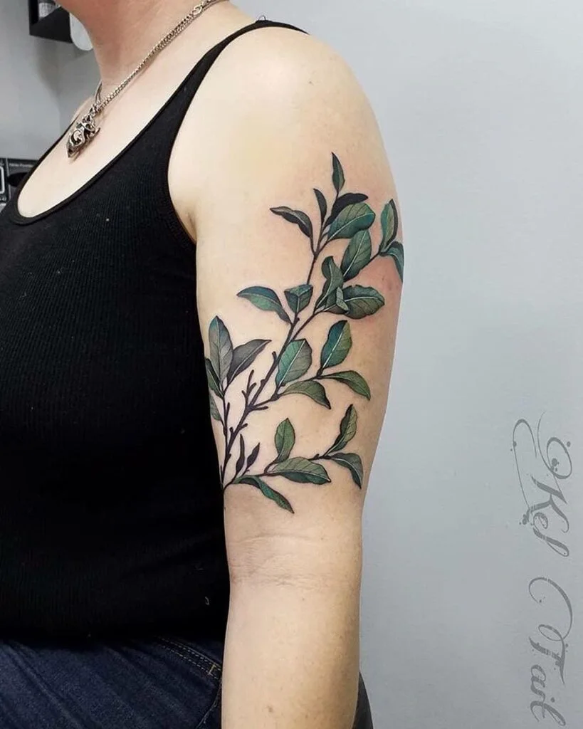 This vibrant tattoo wraps around the upper arm, displaying a branch full of lush green leaves. The artist uses subtle shading and color gradients to add dimension, making the leaves appear almost natural against the skin. The flowing branch structure enhances the arm’s natural shape.