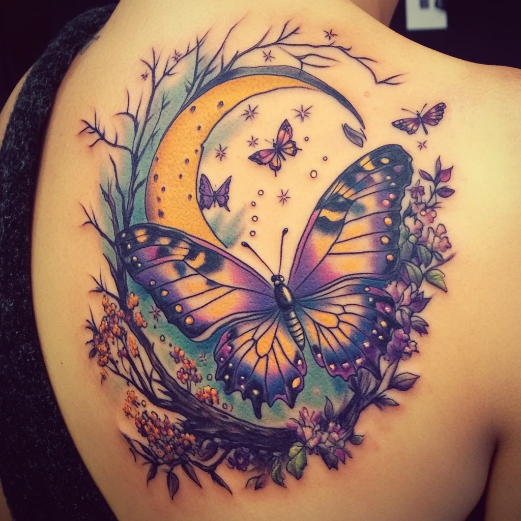 1. Butterfly and Moon Tattoo A butterfly and moon tattoo merges two deeply symbolic elements, representing intuition, transformation, and cycles of change. Many designs feature a crescent moon with a butterfly in flight or resting on its curve. The combination of celestial and natural imagery creates a mystical and enchanting effect. This tattoo can be enhanced with stars, clouds, or dot work to add dimension. It is a perfect choice for those drawn to celestial themes and the symbolism of personal growth and renewal. The back, ribs, or forearm serve as ideal placements for this dreamy design.