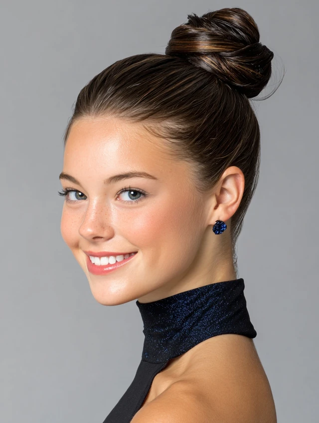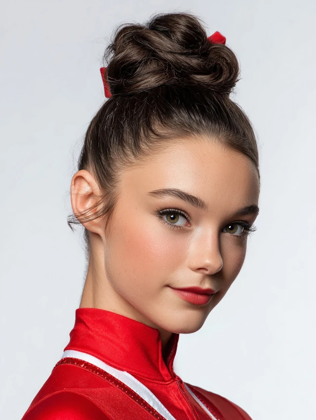 A high cheer bun is clean, secure, and perfect for routines that need zero hair movement.