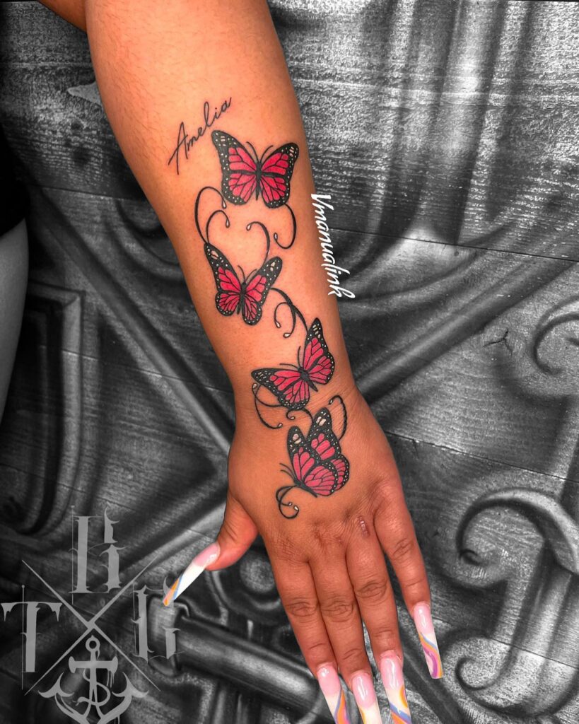 This colorful tattoo features multiple butterflies in vibrant shades of red and black, placed beautifully along the forearm and hand. Above the design, a name inscription adds a personal touch, making the tattoo both decorative and meaningful. Butterflies symbolize freedom and transformation, while the use of bright colors enhances their energy and liveliness.