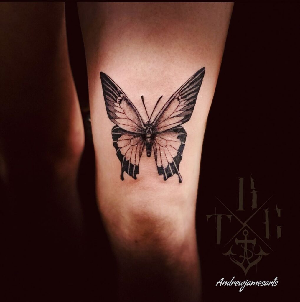 This striking butterfly tattoo on the thigh uses dark shading and bold lines to create a dramatic effect. The wings, spread open in perfect symmetry, emphasize strength, freedom, and transformation. The black and gray tones enhance its boldness while keeping it elegant.