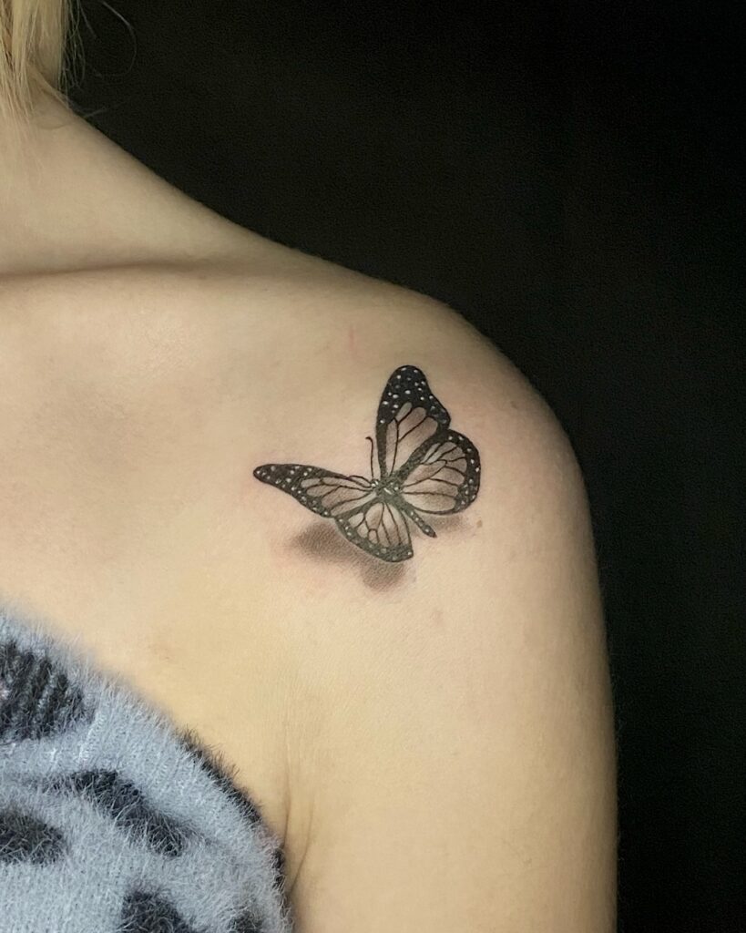 Delicately placed on the shoulder, this butterfly tattoo exudes elegance and femininity. The fine detailing of the wings, enhanced with soft shading, gives it a realistic yet subtle charm. Butterflies symbolize rebirth, transformation, and beauty—reminding the wearer of growth and renewal.