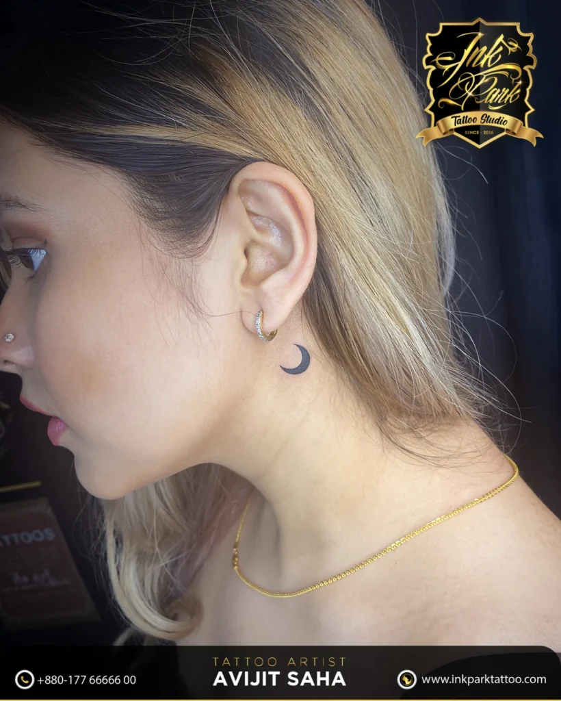 Placed just behind the ear, this small crescent moon tattoo is subtle yet deeply symbolic. The moon has long been associated with feminine energy, intuition, and cycles of growth, making this design rich with meaning.
