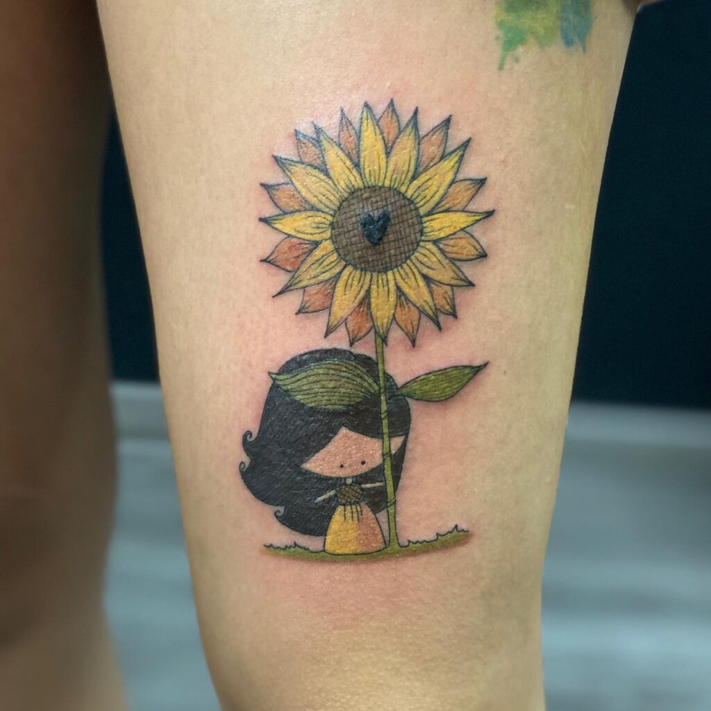 This colorful and playful tattoo features a cartoon-style girl hiding behind a tall sunflower with a heart detail in the center. Bright yellows and greens bring the design to life, giving it a cheerful and youthful vibe.