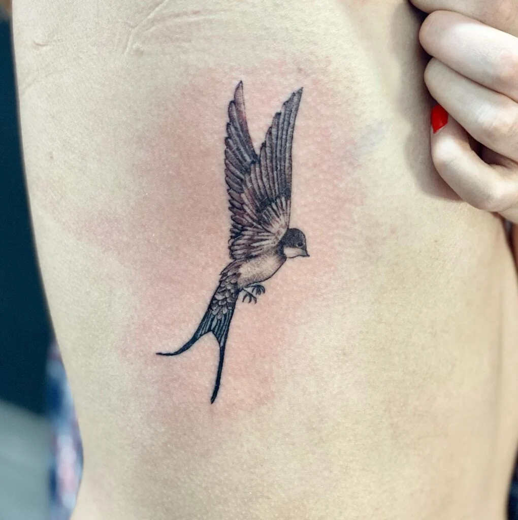 This delicate swallow tattoo, placed along the ribcage, captures the bird in mid-flight with wings stretched high. The fine shading and intricate feather details give it a realistic touch while still feeling soft and feminine.