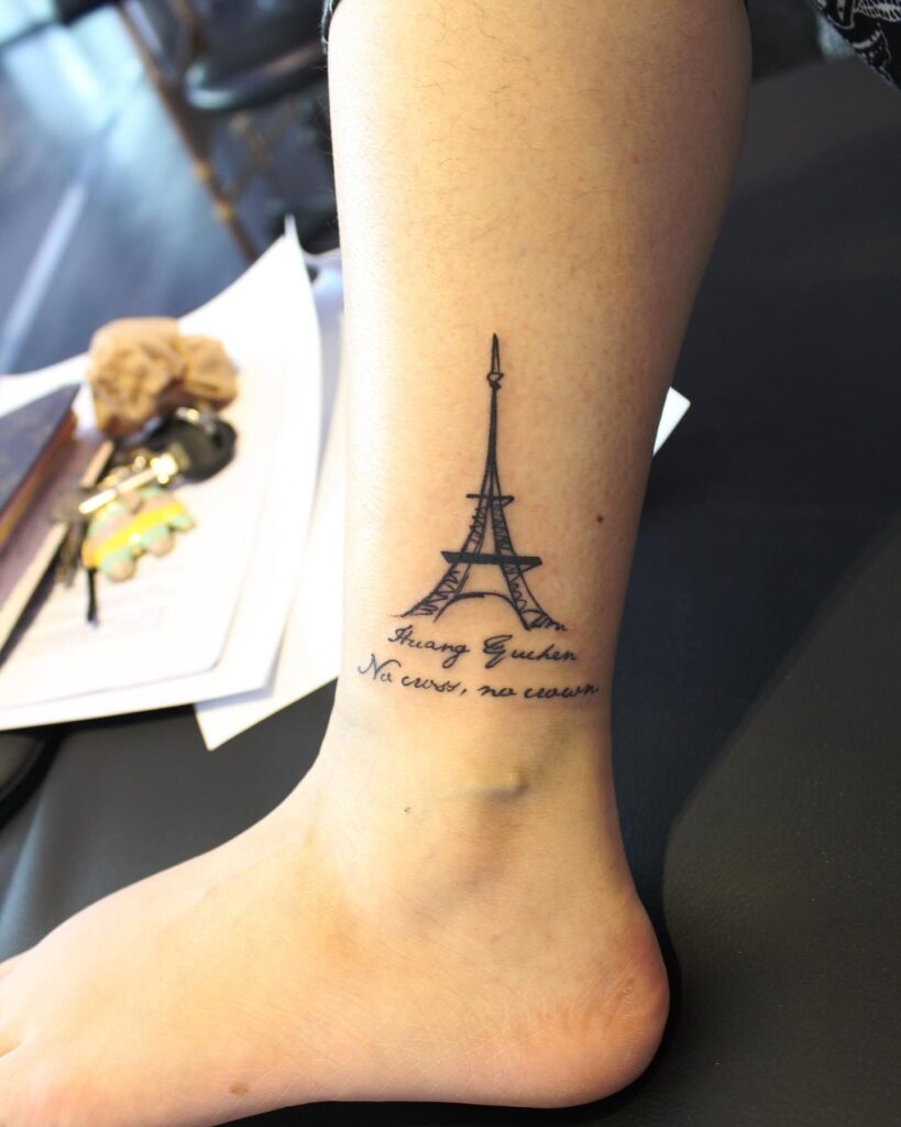 This ankle tattoo combines the iconic Eiffel Tower with delicate script beneath, creating a design that symbolizes romance, dreams, and personal inspiration. The fine lines of the tower add a sense of elegance, while the accompanying phrase “No cross, no crown” emphasizes resilience and triumph through challenges.