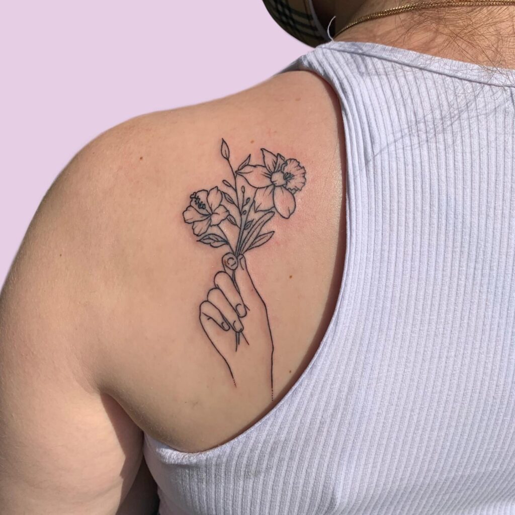 This elegant tattoo features a hand delicately holding a bouquet of blooming flowers, placed beautifully on the shoulder blade. The fine linework creates a graceful, almost sketch-like quality, while the flowers symbolize beauty, hope, and renewal.