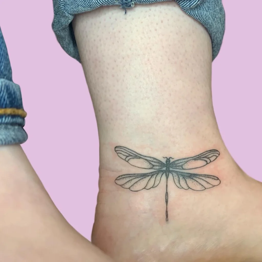 This ankle tattoo of a dragonfly features clean, simple lines and a soft dot-shading effect on its wings. Positioned perfectly on the ankle, it creates a light, airy aesthetic while remaining subtle and elegant.