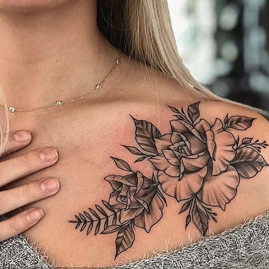 This striking floral tattoo stretches across the collarbone, showcasing beautifully shaded roses intertwined with leaves. The detailed linework and soft gradients give the flowers a realistic yet artistic appearance. Roses symbolize love, passion, and beauty, while placement along the collarbone highlights the body’s natural elegance.