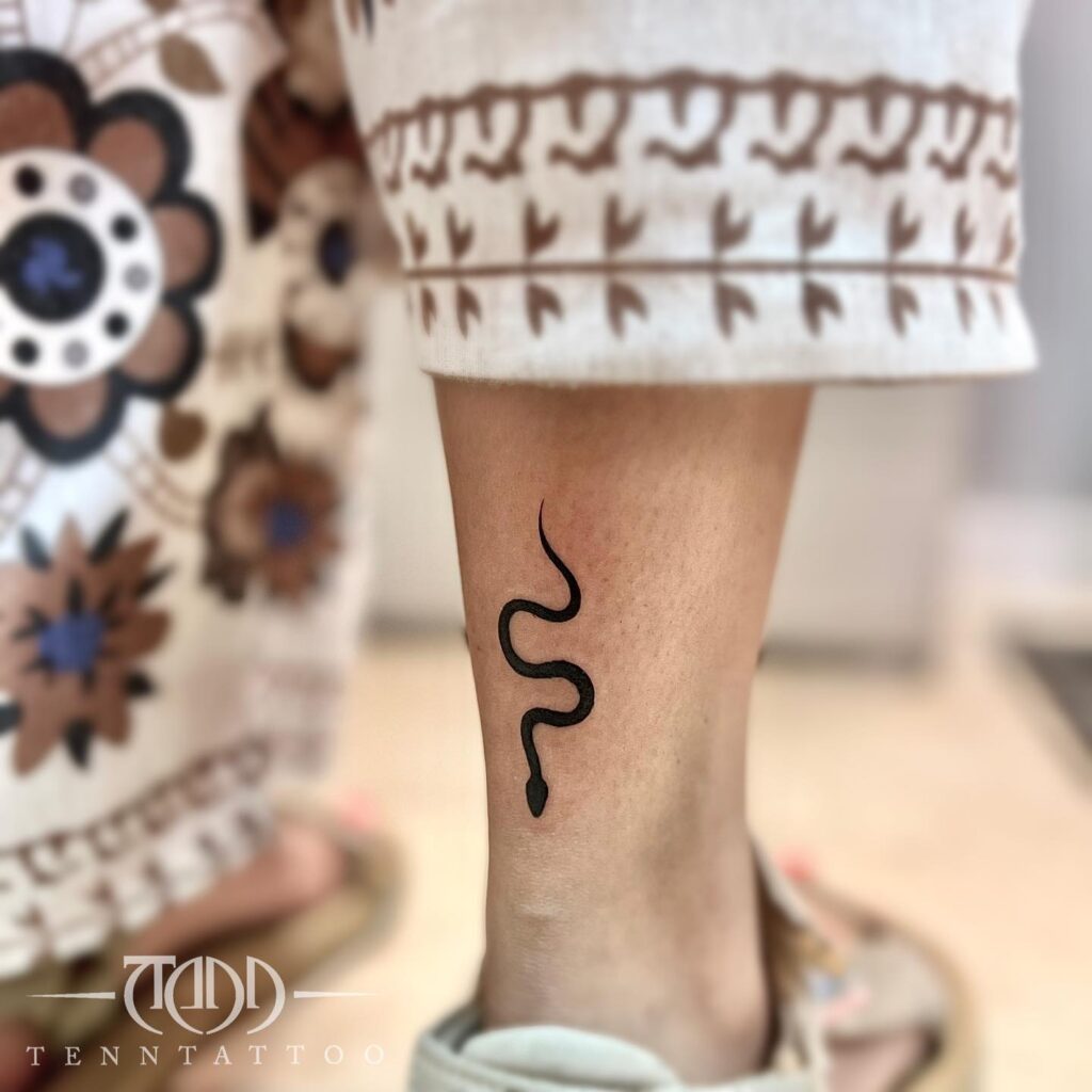 This minimalist snake tattoo curls gracefully along the ankle, using bold black ink to create a sleek and elegant form. Snakes represent rebirth, transformation, and protection, making this design powerful in its simplicity.
