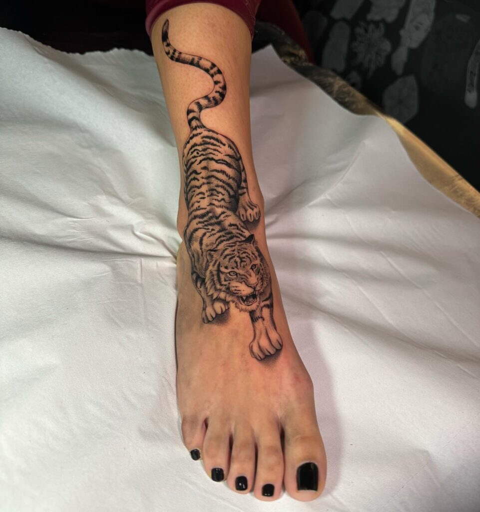 Bold and commanding, this tattoo showcases a tiger in motion, extending from the ankle to the foot. The detailed stripes, muscular body, and intense facial expression capture the essence of strength, courage, and determination.
