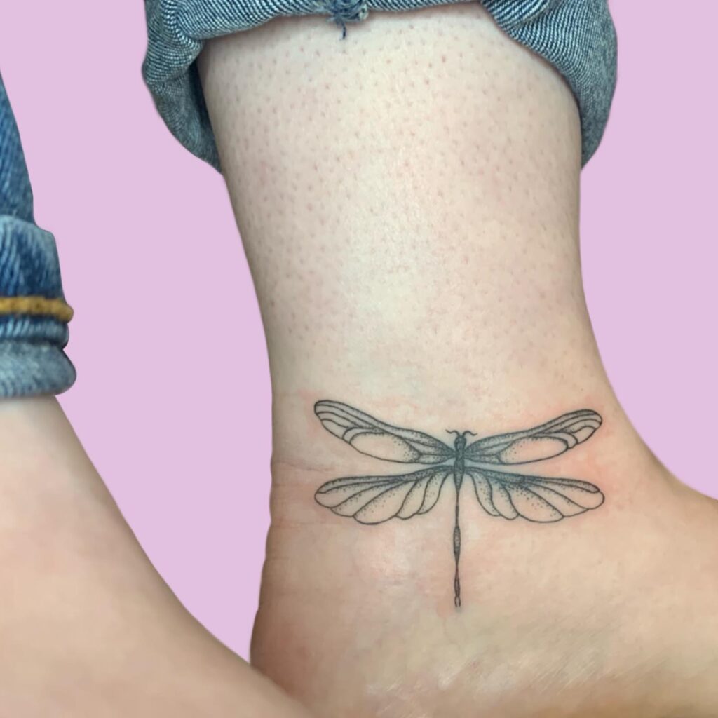 This ankle tattoo of a dragonfly features clean, simple lines and a soft dot-shading effect on its wings. Positioned perfectly on the ankle, it creates a light, airy aesthetic while remaining subtle and elegant.