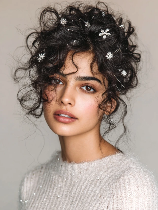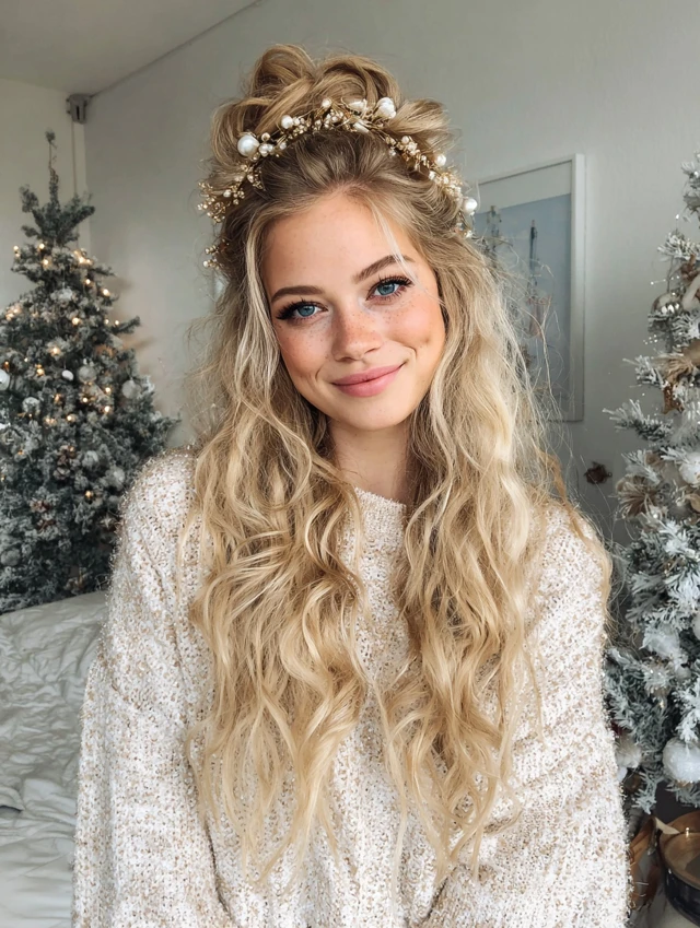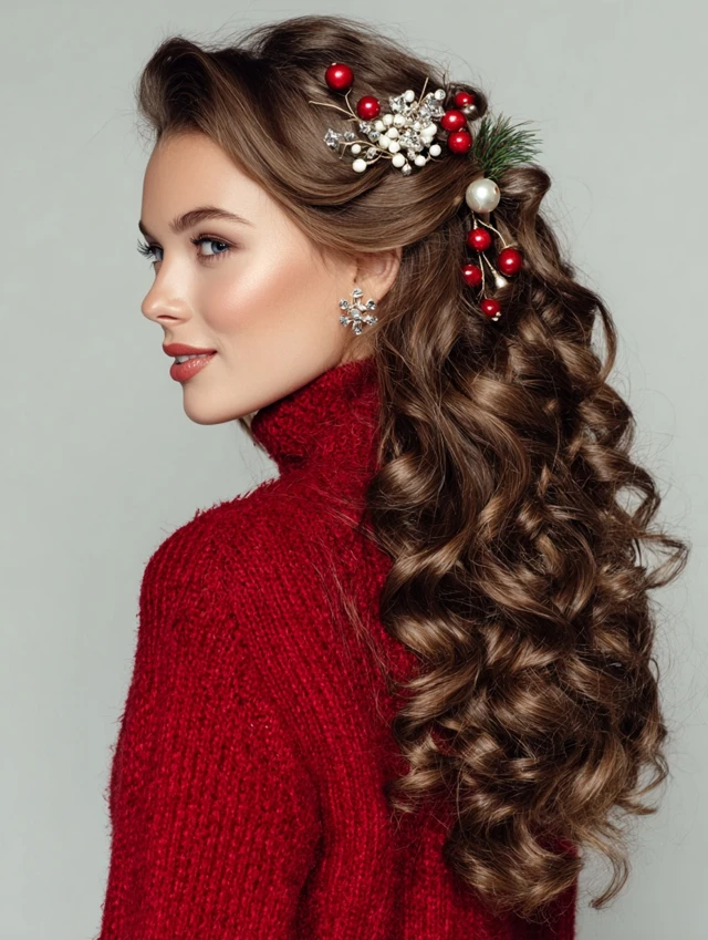 Half-up curls combine softness with structure. Add festive clips — snowflakes, pearls, gold accents — for a magical effect.