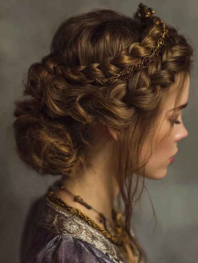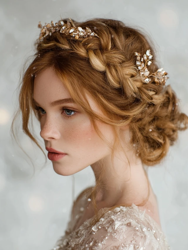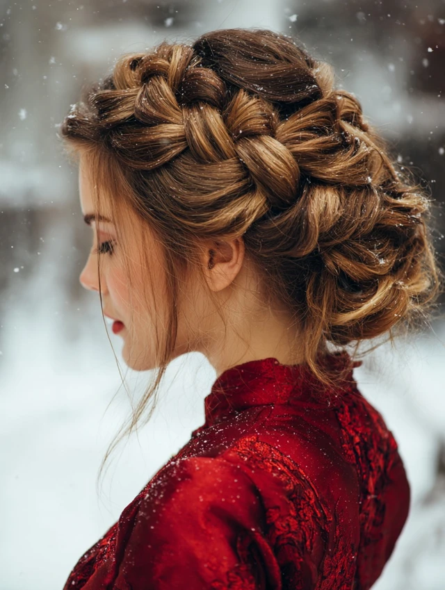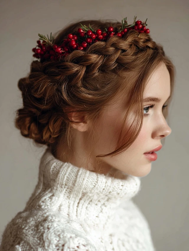 A braided crown looks like a holiday halo — soft, feminine, and photo-ready. Perfect for women who love a romantic holiday aesthetic.