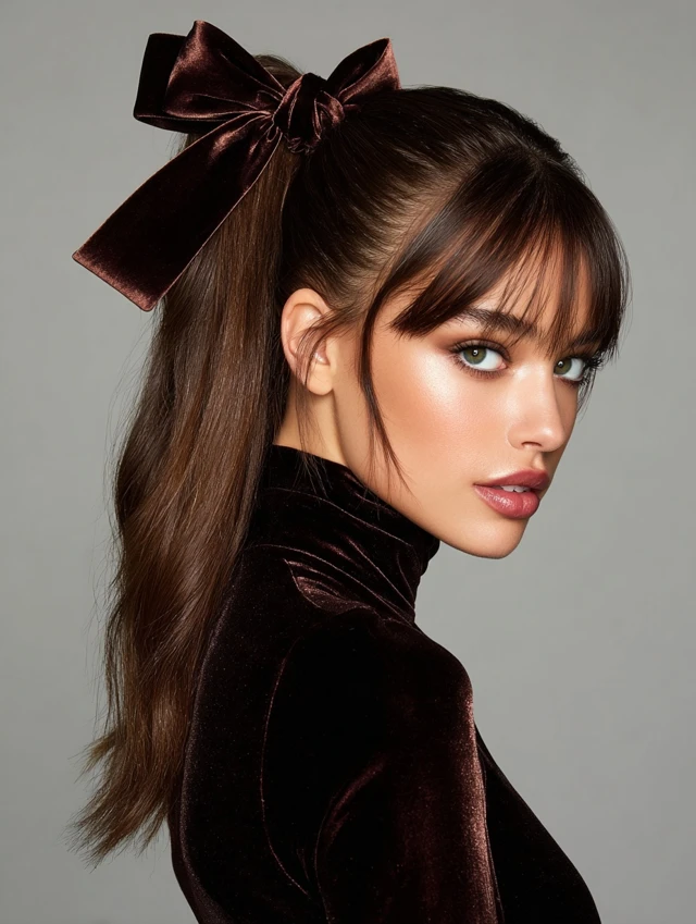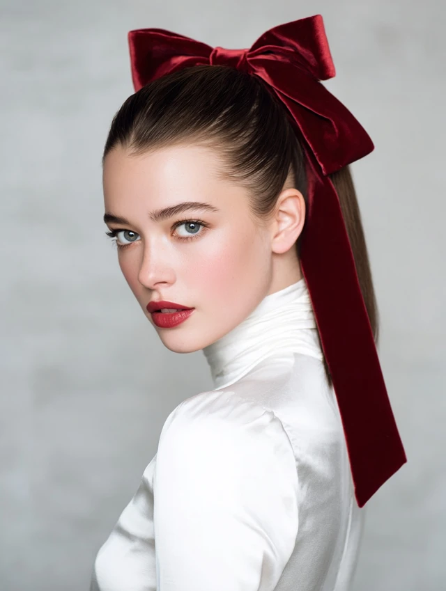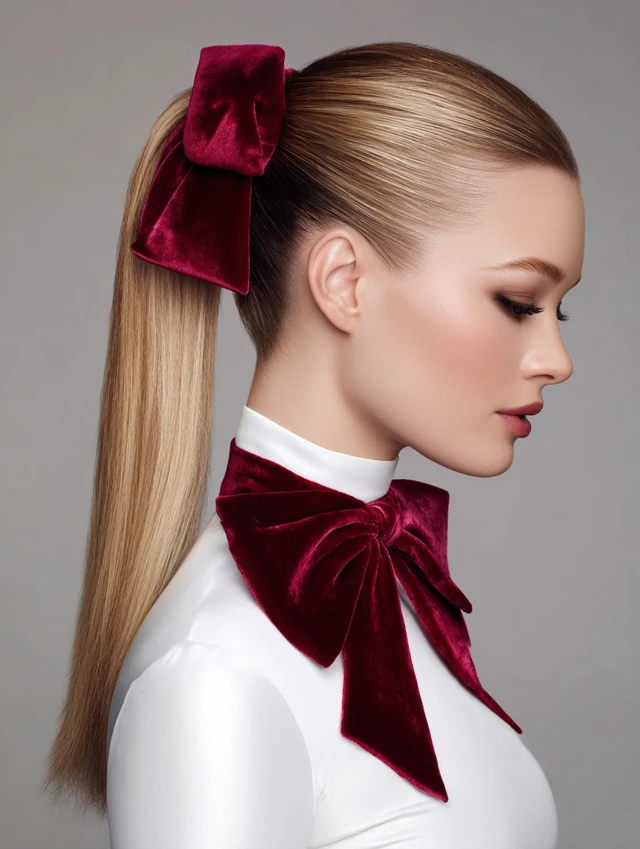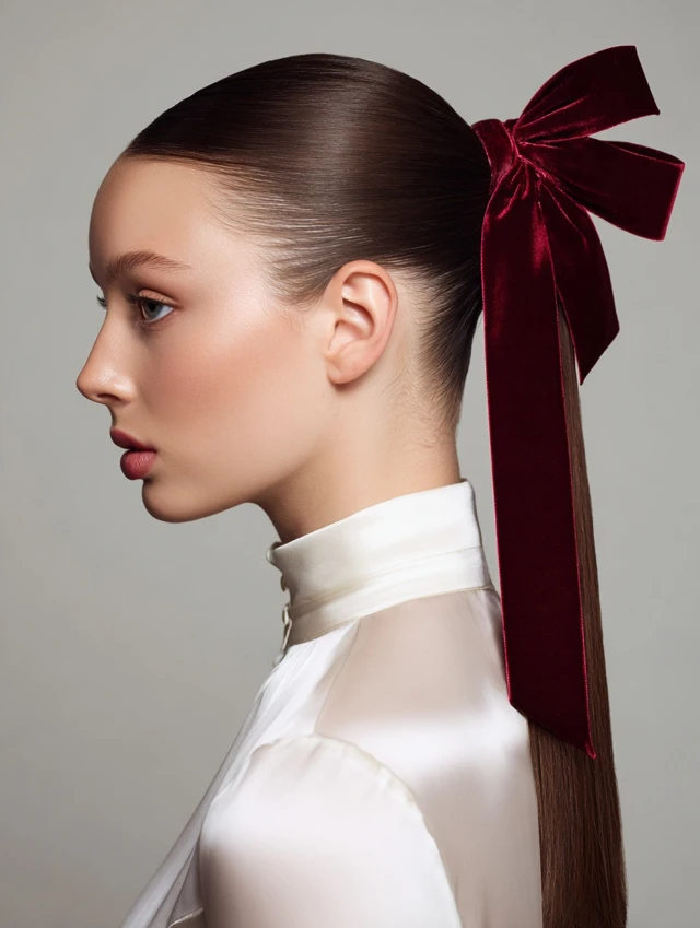 A sleek ponytail is chic and clean — add a red, green, or black velvet bow and it instantly becomes Christmas-ready.