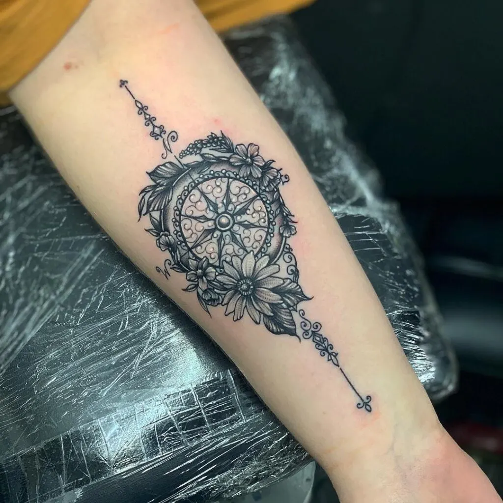 This forearm tattoo features an ornamental compass with intricate filigree detailing, framed by blooming flowers. The delicate lace-like elements add elegance and a feminine flair, while the compass remains a strong symbol of direction and guidance.