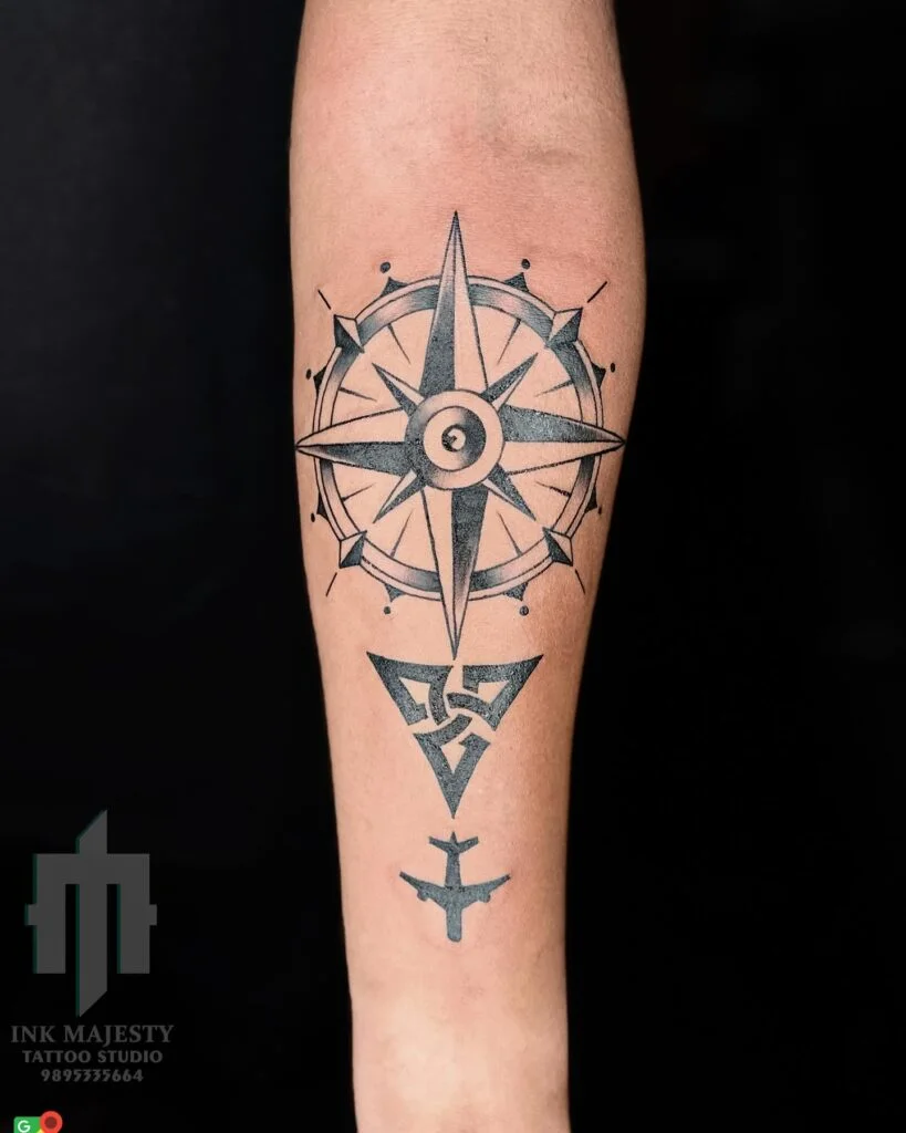 This sleek compass tattoo sits elegantly on the upper arm, designed in a crisp black and gray style. Its clean lines and sharp points make it a striking piece while remaining subtle and versatile. The compass arrow extends vertically, symbolizing balance and the strength to stay focused on life’s path.